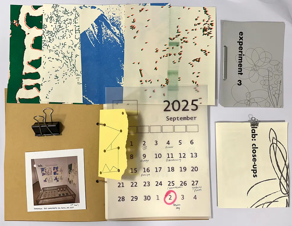 A collaborative hands-on, experimental, multimedia project with my friends, Anne and Yuting, that calls attention to the overlooked details of overlooked plants scattered throughout the fast-paced, constantly moving city of Boston. Through petri dishes, epoxy resin, image tracing, risograph printing, hand-crafted overlapping cards, and laser-cut acrylic plates, we built an observatory-lab–inspired space. The installation invites people to pause, observe, and reconnect with the quiet life that thrives within the city’s constant motion.